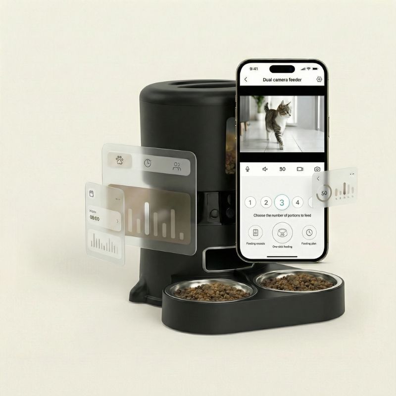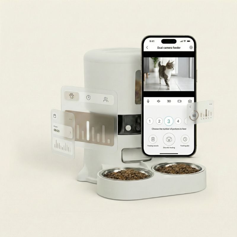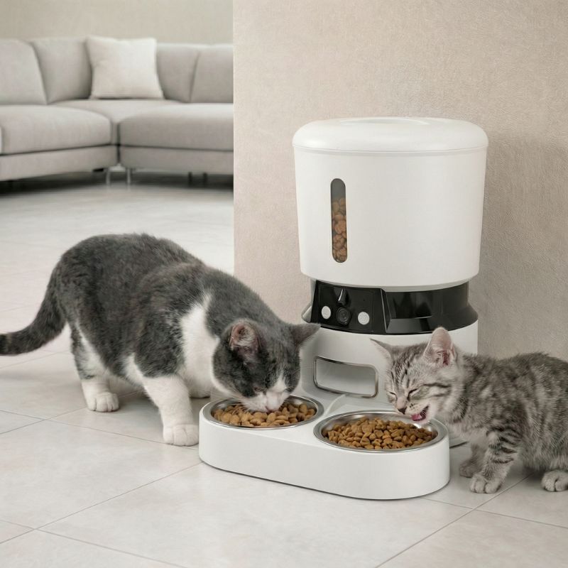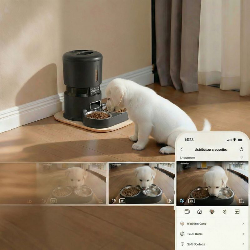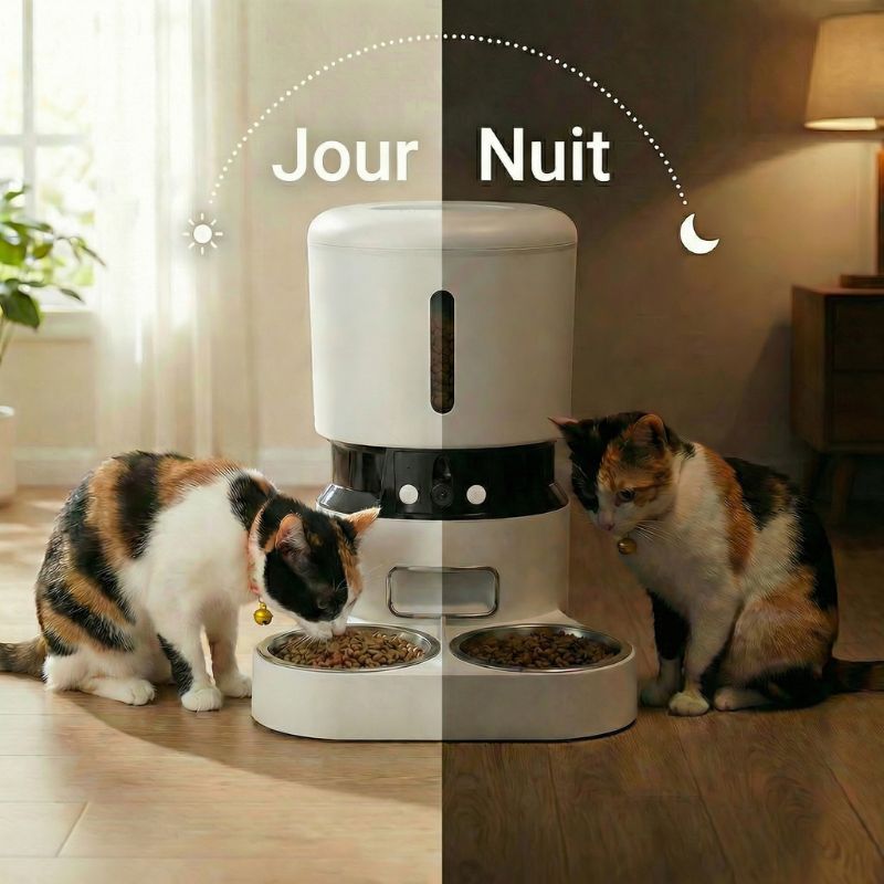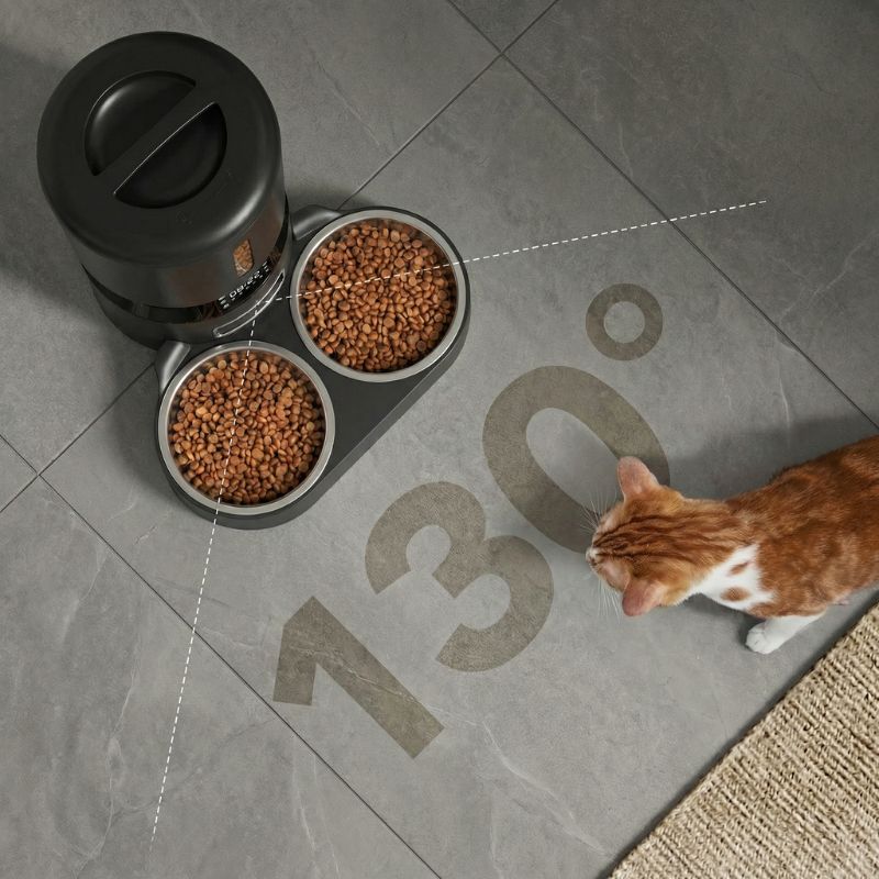 Distribution Simultanée (50/50) : Le répartiteur intelligent sert la même quantité de nourriture dans les deux bols au même moment. Vos deux compagnons mangent côte à côte, sans conflit ni attente.