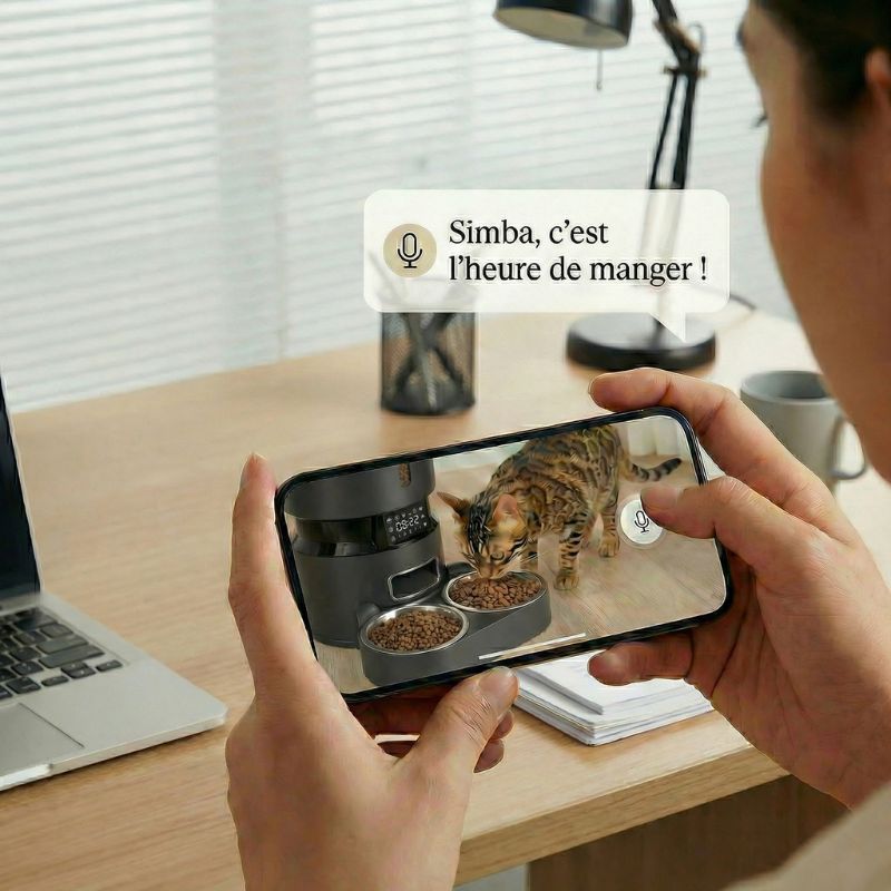 Appel Vocal Personnalisé : Enregistrez votre voix (ex: "Les loulous, à table !") pour qu'elle se déclenche automatiquement à chaque repas. Ils se sentiront appelés par vous, même si vous êtes au travail.