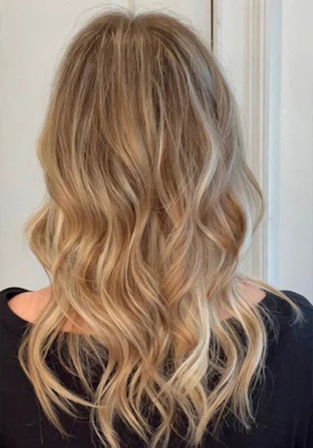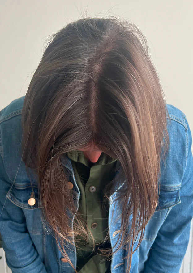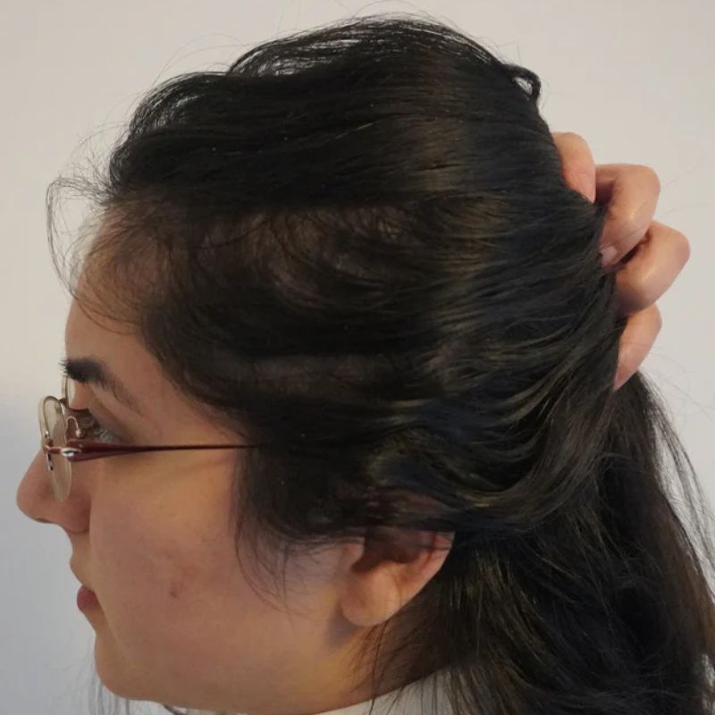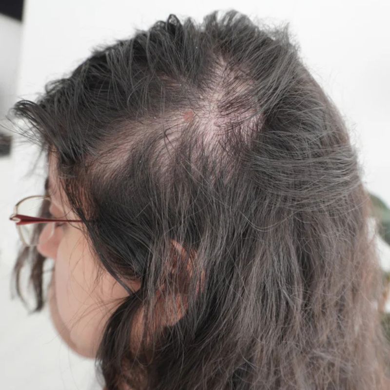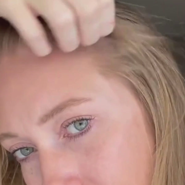 Tampona suavemente el cuero cabelludo, enfocándote en las zonas con poca densidad o afectadas por la caída del cabello.