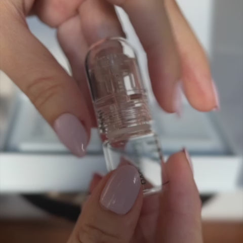 Gira suavemente la cabeza con microagujas para abrirla. Llena la cámara del dispositivo con la cantidad recomendada de sérum.